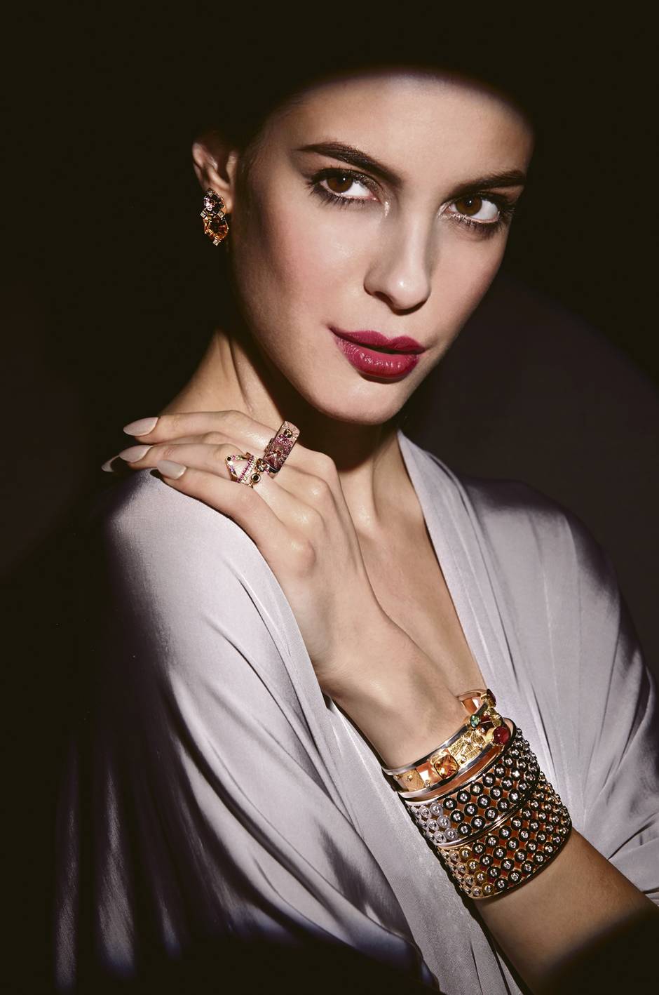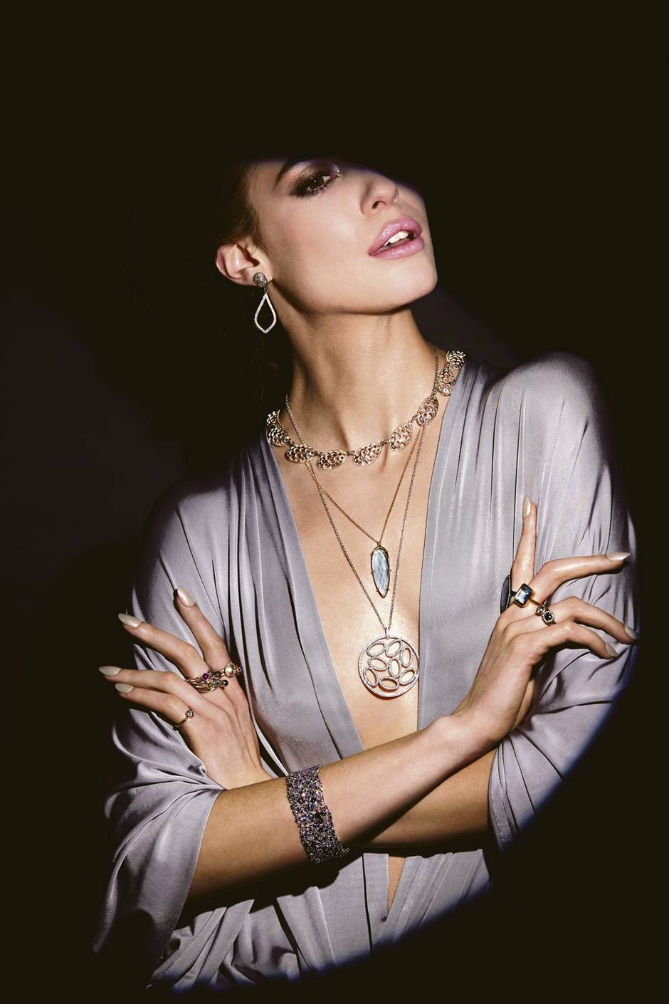 Sterling-silver, 14-carat yellow-gold and glass-enamel brooch (in hair), $1,000, 14-carat rose-gold and diamond Cell pendant, $700 through www.emilygill.ca. Swirl multicoloured pastel-sapphire and diamond ear clips, $28,500 at JDJ Jewellery (www.jdj-jewellery.com). Zahira necklace, $1,095, Maria necklace, $495 through www.hillbergandberk.com. Lapis Armour necklace, $280 through www.leahalexandra.com. Sterling-silver and smokey-quartz necklace, $210 through www.erintracy.ca. Freshwater-pearl and black bricolette diamond necklace, $3,750 through www.xamdiamonds.com). Jumpsuit (worn throughout), $1,195 through www.gretaconstantine.com. 18-carat yellow-gold and diamond Geometric earrings, $10,000, 18-carat yellow-gold and diamond Hardware bracelet, $44,000, 18-carat white-gold and diamond Hardware bracelet, $32,000 through www.mindham.com. Nuit En Lumière sterling-silver, rose-gold and pavé pink, yellow and orange sapphire double ring, $2,400 through www.k8jewelry.com. Adore Triangle ring, $790, Stack ring with pink sapphires, $750, Stack ring with citrine, $810, Adore Bezel ring, $790 through www.haathihousejewellery.com. 18-carat yellow-gold and silver bracelet with tourmalines and diamond, $12,000 at Frida.