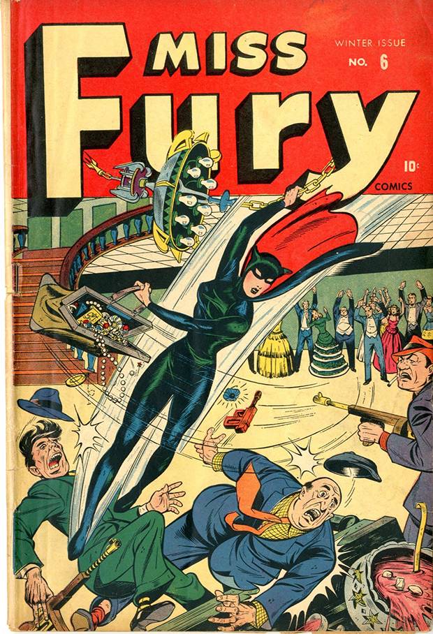 "I've always said that she's like film noir," Robbins explains of Drake/Fury, who has no innate superpowers. "But she can fight for herself even if the only weapon she is using is a telephone or a high-heeled shoe!" Crime fighting in her signature black catsuit, Miss Fury has natural agility and bravery, the latter presumably fuelled by a rage her surname more than suggests.