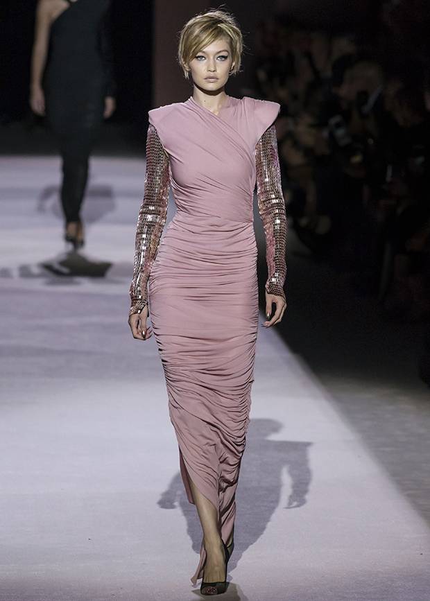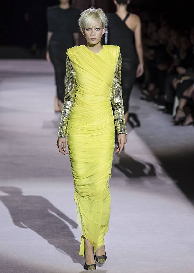 All three are visually referenced in Tom Ford's latest runway show. Shirred and gathered jersey recalled actor Elsa Lanchester's Bride garb, down to the glam sequinned, bandage-style sleeves peeking out from the strong retro shoulders of his finale gowns.