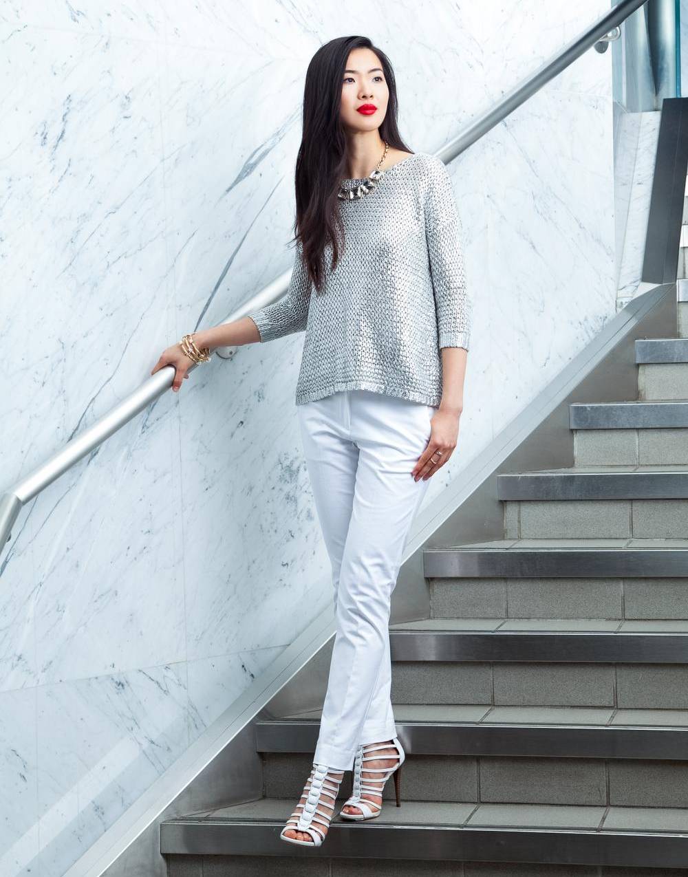 Unless you want to channel your inner disco diva, avoid wearing head-to-toe metallics at the office. A pair of tailored white slacks complement the shine while maintaining an air of understated elegance.