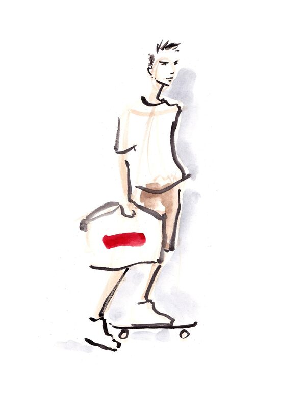 Just then, a simply dressed young man walks out of the store with a bag of merchandise in one hand and his skateboard in the other. In one elegant gesture, he drops the skateboard onto the sidewalk, jumps on and glides away. Until the next drop…