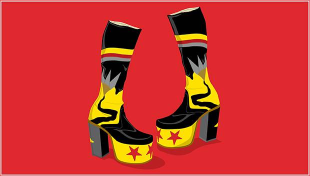 The theatricality and glamorous decadence of the platform embraced by Bowie, Prince and female performers is now being championed by men again, from Quebecois designer Rad Hourani's unisex heels to Alessandro Michele's striped four-inch frankensneakers for Gucci. And while Master John is long gone, John Fluevog's Munster endures. The style has been revived this season as the strappy and only slightly more demure Dee. The last days of disco play on.