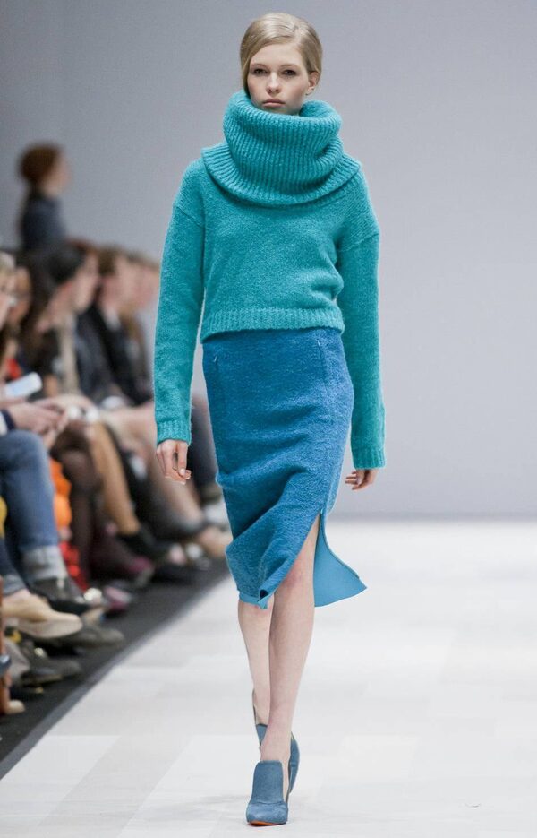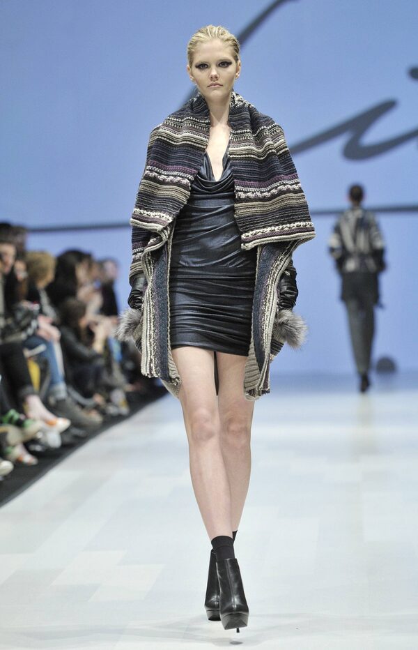 Many featured slouchy, oversized collars, but Line’s sweaters and ponchos were far from dumpy, especially when styled with fierce stiletto booties and look-at-me leather/fur gloves - to say nothing of a ruched charcoal mini dress.