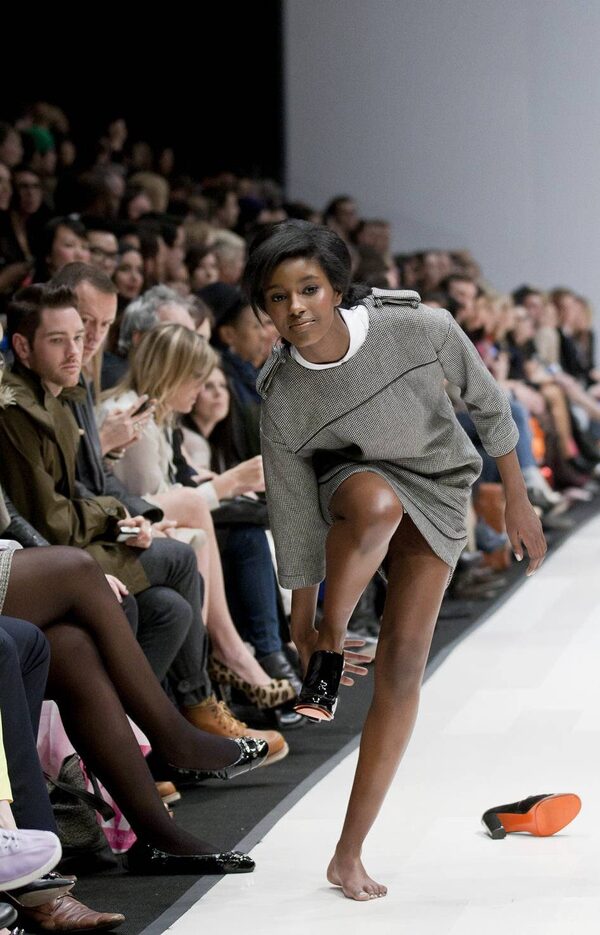 Shoes were distinctive - kitten heeled pointy loafers in a mix of patent-leather and tweed, patent low-heeled knee-high boots - and offered a final surprise as models clacked their way backstage: the brand’s signature orange splashed across every sole.