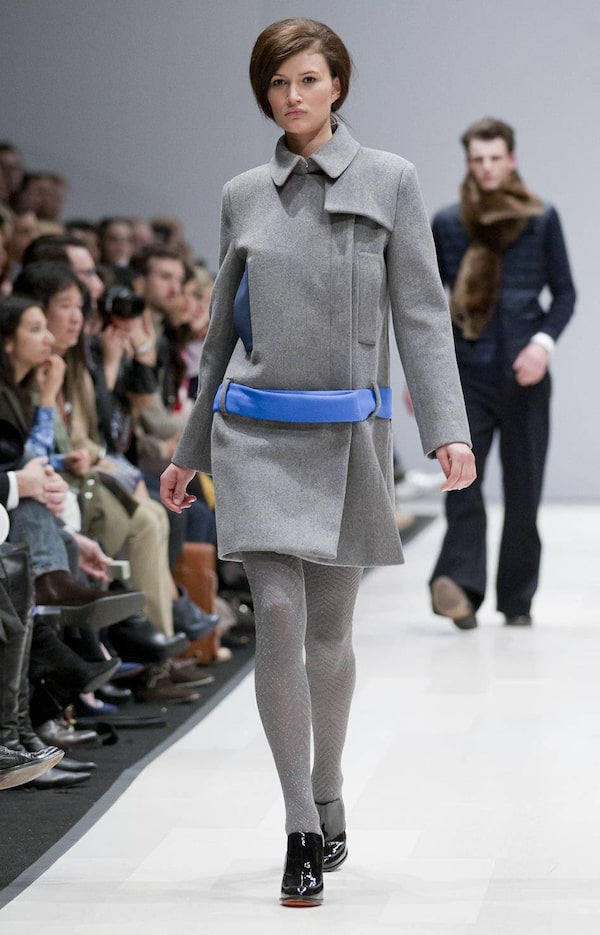 The palette stuck closely to traditional fall hues like navy, burgundy and burnt orange, but some pieces got an injection of bright colour from accessories, such as the blue neoprene belt on this grey topper.