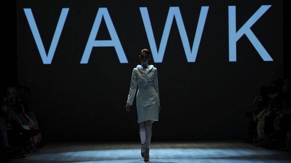 A model shows a creation by Vawk while walking the runway at LG Fashion Week.