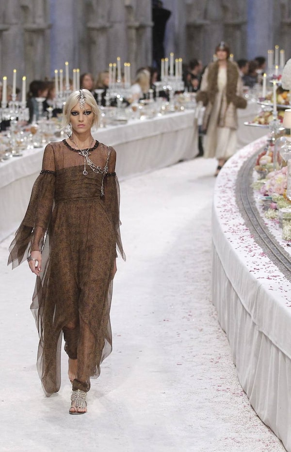 An upper hall of the Grand Palais in Paris was transformed into a dreamy banquet. Think traditional high tea with equal parts Bombay and Paris. Every single detail, from huge (the backdrop of aged, decorative arches) to tiny (gold foil dusted onto the fruit) is proof Chanel never goes halfway.Benoit Tessier / Reuters