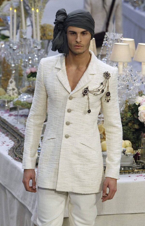 Lagerfeld didn’t leave out the men entirely. All of the looks featured wrapped headdresses that weren’t quite turbans but might just find a following among the unlikeliest types. Lil’ Wayne, perhaps? And doesn’t every man need a four-button white bouclé jacket?Remy de la Mauviniere / AP