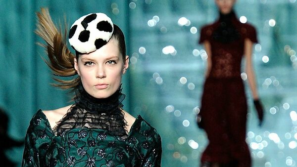 It was a season of high sheen for many, with Marc Jacobs leading the pack. In a hodge-podge of references to some of his best past collections, the brazen designer created a striking collection chock full of whimsy. Models sporting felt, vinyl, and pony-skin berets with chin-straps (created by milliner Stephen Jones) strutted an eclectic array of outfits with strict, long and lean silhouettes. With garments made of fabrics as disparate as lace and latex, Jacobs's witty offering played with polka dots (an ode to his very first collection, twenty-odd years ago), knee-length pencil skirts, shiny mid-calf wedge boots, lots of Lurex, both real and faux fur, fake crocodile, giant dot pailettes, and plastic cabochon studs. Forget about last season's dreamy flow: Jacobs is suddenly about severity, with a healthy helping of humour.