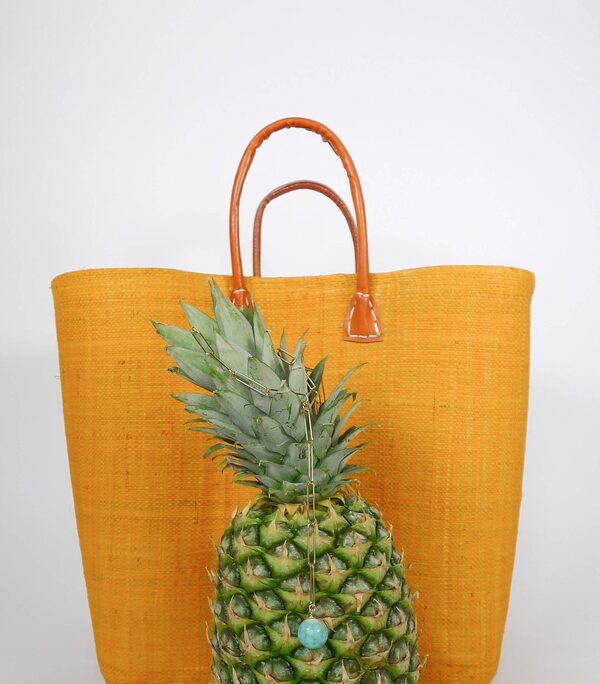 A market basket with leather handles makes shopping a joy.