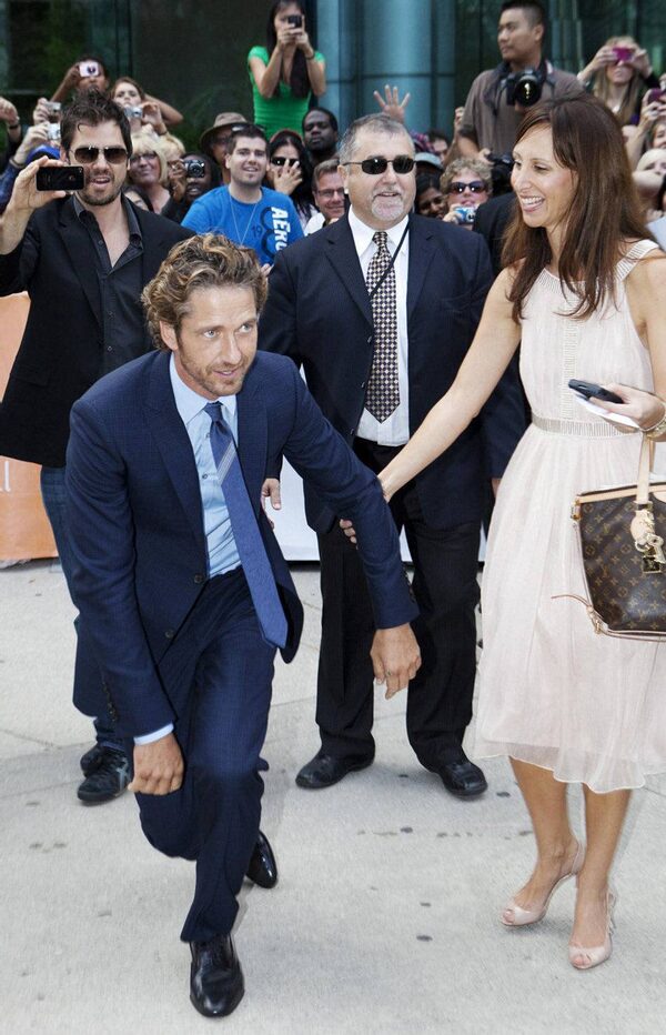 Actor Gerard Butler arrives on the red carpet while pretending to fall over for the film "Machine Gun Preacher" during the 36th Toronto International Film Festival (TIFF) in Toronto, September 11, 2011. TIFF runs from September 8-18. REUTERS/Mark BlinchReuters