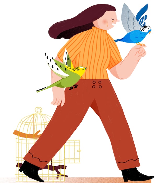 My mighty gods are winged and fickle: Zeus is a five-year-old, lemon-yellow and lime-green budgie with the temperament of Gandhi. Zephyr is two years old, spotted black, white and robin’s-egg blue, like an abstract painting. His temperament is akin to Donald Trump’s.