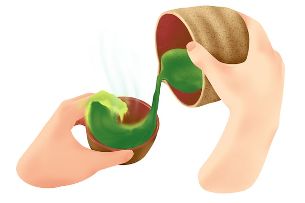 Water churns wildly on the stove, a tiny ocean, confined only by a kettle. Moments later, the gurgling settles as it’s poured into a sturdy, earthenware bowl and whisked with powdered leaves.