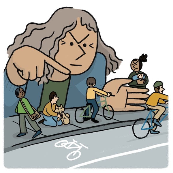 And when one of those foot-bound nuisances (like me) points to the lovely, purpose-built, empty cycling lane running parallel to the sidewalk and says something like, “Young man, please walk on the sidewalk, ride on the road,” I receive one of the following: a blank look, the middle finger or, more commonly, a verbal riposte. The favourite? “Shut up, you f-----g fat-a---d b---h.” (For help decoding, ask any woman.)