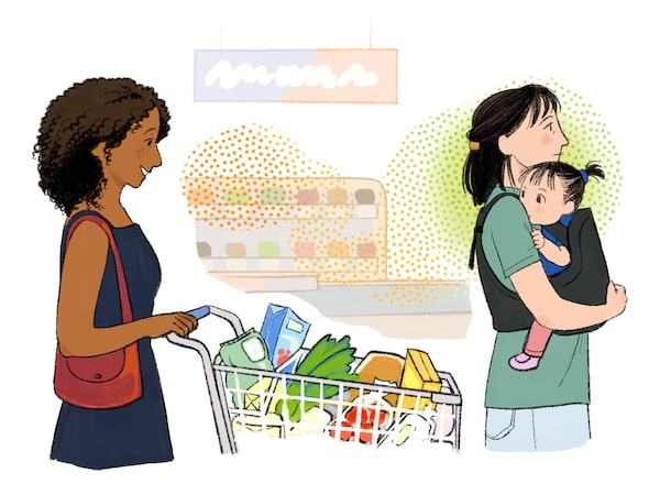 I reach for a People magazine and flip through it, searching for some juicy sustenance. But something compels me to look up. A toddler, attached to the woman just ahead in line, is staring right at me. She is nestled in her carrier and has poked her head up and over her mom’s shoulder to get a better look at the view. I feel my mouth stretch across my face with a smile.