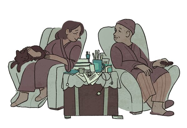 I guess this is where some marriages end up. My husband has just completed his second round of chemotherapy for lymphoma, and I am high as a kite on weed to help forget about the pain from a bum shoulder and a migraine. We are both retired high-school teachers. We did our time in the trenches of education, followed all the rules, got into the real estate market at the right time, saved money, raised two children and draw on our pension.