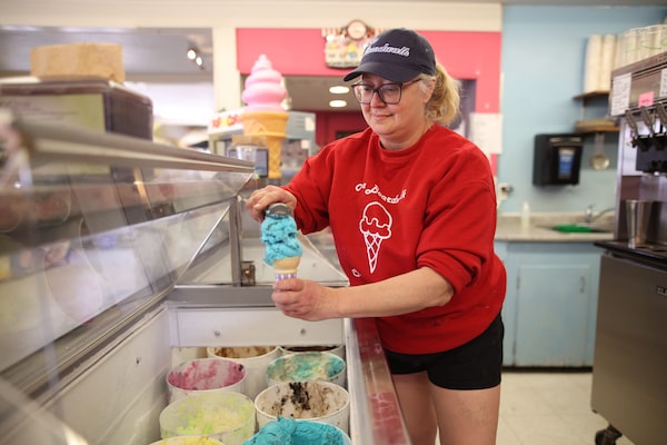 Sandra Shwetz, owner of The Boardwalk on Clear Lake in Wasagaming, Man., scoops blue licorice ice cream into a cone at the store on a warm spring day.TIM SMITH/The Globe and Mail