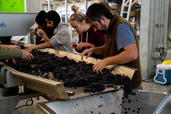 Employees sort pinot noir grapes at the CedarCreek facility.
