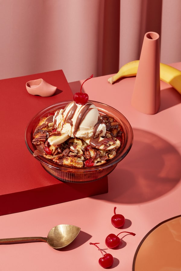 Let’s call this one a dessert casserole. An easy banana split-flavoured bread pudding is topped with a fresh banana split so that you get every temperature and texture in one bite. It’s got retro appeal so you can go basic with canned whipped cream and neon maraschino cherries, or feel free to fancify it with amarena cherries and freshly whipped cream. Or, split the difference.