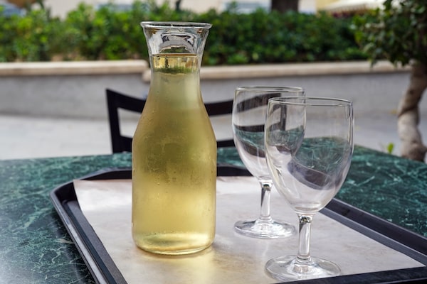 A carafe of white wine and two glasses.chrupka/iStockPhoto / Getty Images