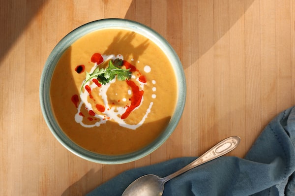 This soup is excellent for using leftover roasted squash (or the end of a can of pumpkin purée), and if you have a gnarly squash that’s tricky to handle, poke it a few times with a knife to allow steam to escape and roast it whole, directly on the oven rack, even alongside something else you’re baking, for about an hour or until it starts to collapse in on itself. Once it cools enough to handle, you can break it open with your hands and scoop the soft flesh into your soup pot. Puréed soups are also ideal for frozen cubed squash, which will have a softer texture once thawed, and will cook more quickly. Split red lentils boost protein and fibre (on top of all the other veg), and cook through in about 10 minutes.