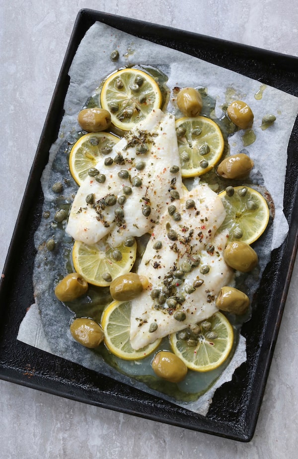 Thinly slice your lemon(s), leaving about a quarter at one end. Spread the slices on a parchment-lined sheet and lie your fish fillet(s) overtop. Squeeze the juice from the reserved end into a small bowl (alternatively, to make it more Marbella-ish, use a splash of red-wine vinegar) and add about twice as much canola, olive or other vegetable oil and the garlic and oregano. Drizzle over the fish and scatter with olives and capers, and season with salt and pepper. Bake for about 10 minutes for thin fillets such as cod, plus an extra five or so if you have a thicker piece of fish such as halibut, until it turns opaque, the edge begins to flake with a fork, and you might see some fat globules rise to the surface.