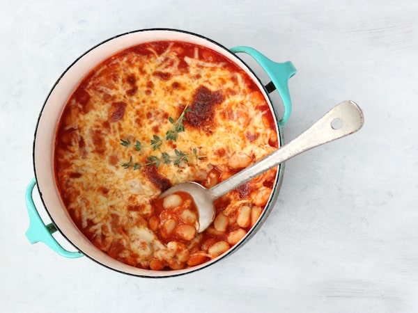 Braised beans are the new baked beans – simmered until tender, then given a tomato sauce bath and broiled with a cheesy lid. There are plenty of ways you can go with this: stir some cooked chunky pasta or gnocchi into the beans before topping with cheese and baking, or serve it straight, with crusty bread for mopping.