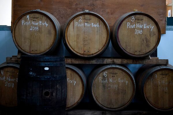 Barrels of pinot noir are stacked at Haygrove Evolution's Sixteen Ridges Winery in Ledbury, England, on Nov. 12, 2020.DANIEL LEAL-OLIVAS/AFP/Getty Images