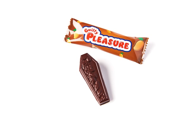 Diners are given a candy bar called Guilty Pleasure, which is filled with mango jam, peanut gianduja, and salted caramel. The bar is shaped like a coffin, referring to child exploitation in the chocolate industry.Claes Bech Poulsen/Supplied