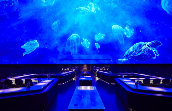 Act Three is where most of the swallowing occurs, under a planetarium dome projected with animated images, such as a swaying coral reef. While you consume and consume, the coral above you dies, leaving garbage and Lego bricks in the sea. And now, for your next impression…!