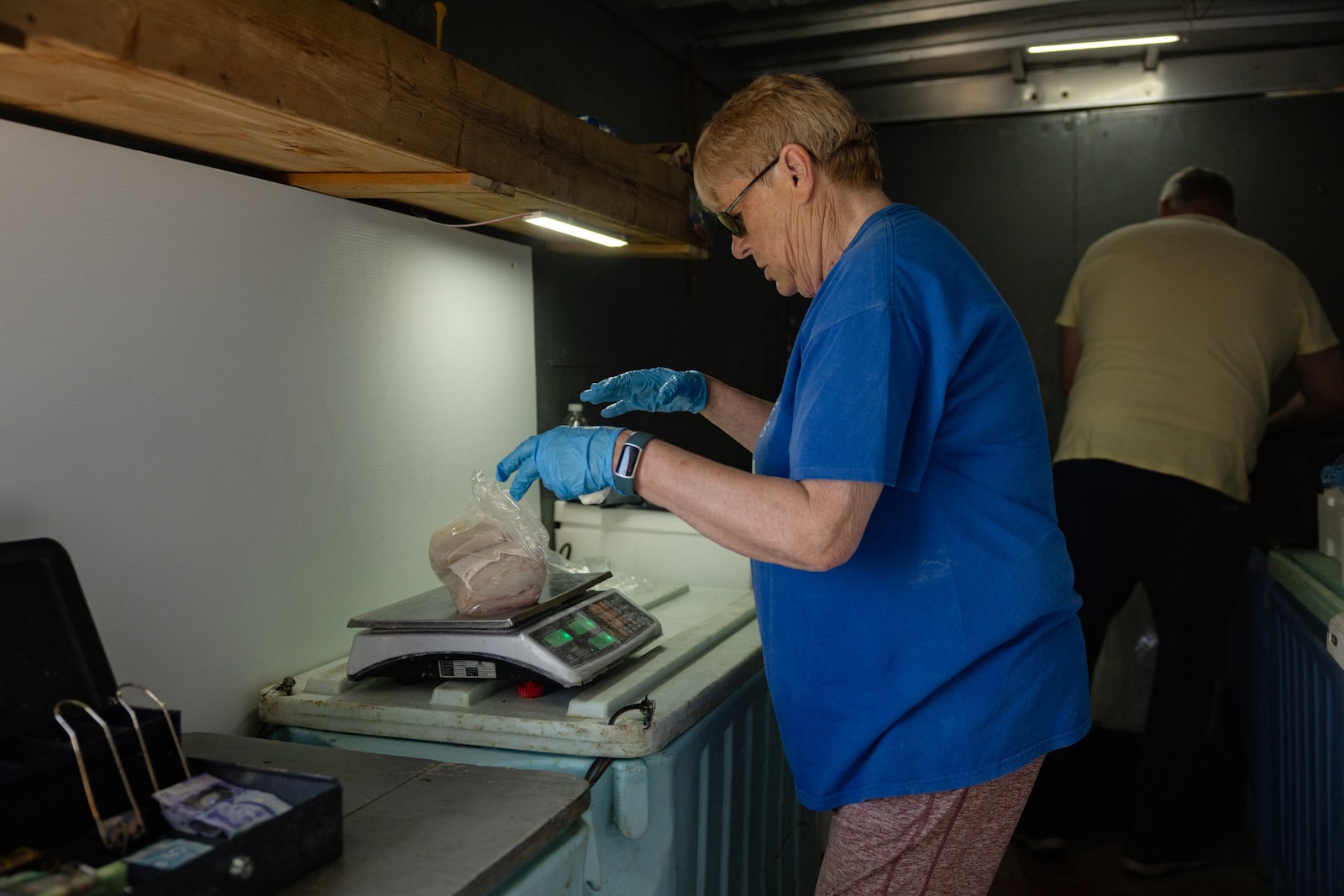 She was one of the first in line when Mr. Nickerson opened, and she picked up several bags of scallops and a few pounds of halibut steaks. She disappeared to get more cash and returned to buy five lobsters.