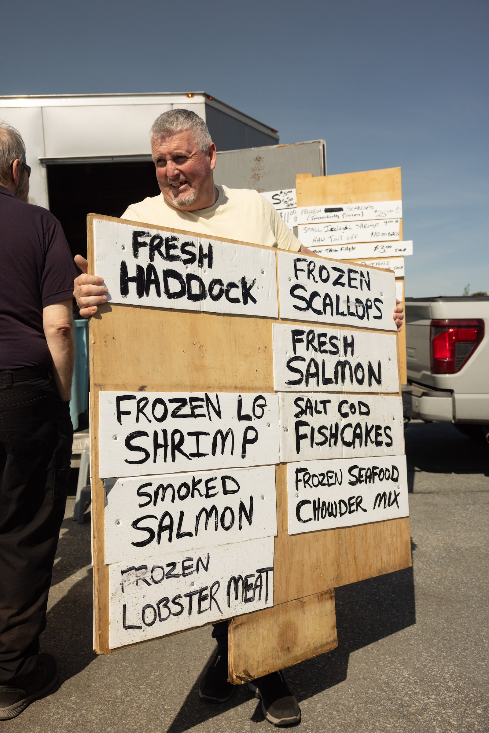 As customers form a queue, Mr. Nickerson drills the price list, scrawled in black marker, to his trailer door: Fresh Haddock $11.00/lb, Rock Crab Claws (Sold in 2 lb bags) $10.00 a bag, Cold Smoked Salmon $20.00/lb. Today, he’s also got mussels, salt cod, salmon portions, Icelandic shrimp and halibut steaks.