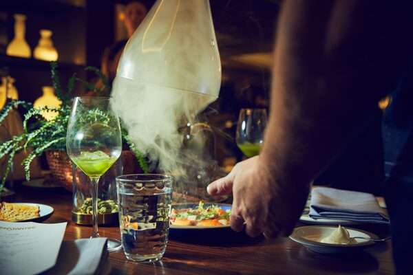 Not every course has to feature active cannabis. Showcase a strain’s fragrant and flavourful aspects through other ways. At this meal, a cloche dome over a fish dish released a cloud of applewood and Mango Haze smoke with a flourish upon serving. Unlike the dollops of labneh and muhamara side dishes, the cloud had no psychoactive THC; similarly, the finely ground keef dusted on the Pineapple Tea rum cocktail was strictly decorative garnish.