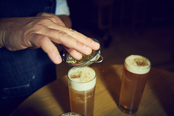 Shake and top with soda and grated nutmeg garnish.