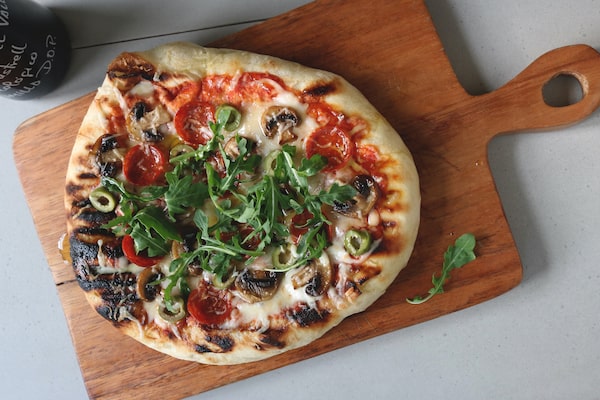 Shape each piece into about a 12-inch round or oval. (It won’t stay round when you put it on the grill, so don’t worry too much about the shape.) Put your first piece of dough directly on the grill (no need to oil it – the heat will create a crust and it won’t stick) and close the lid. Cook for about five minutes, then check and turn it if it’s cooking unevenly. When it’s golden and grill-marked on the bottom, flip it over, turn the heat down to low and quickly top the crust with sauce, cheese and your choice of toppings. Close the lid (this traps the heat, creating an oven-like environment) and cook for another five to 10 minutes, until the cheese melts. Alternatively, slide onto a baking sheet, top with your sauce, cheese and toppings, and transfer to the oven until melted. Repeat with your remaining dough.
