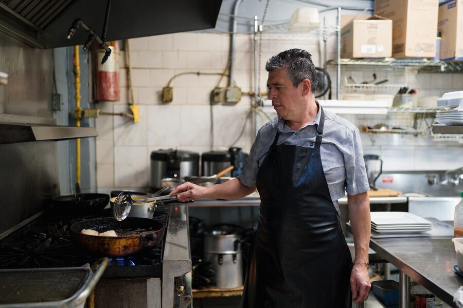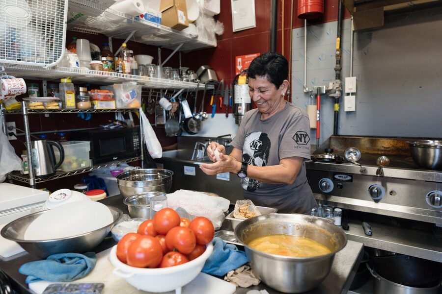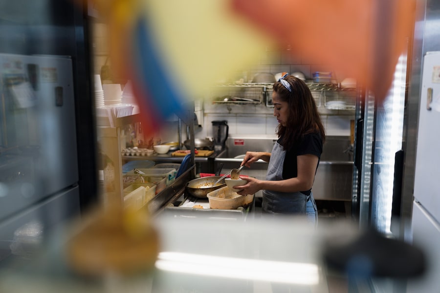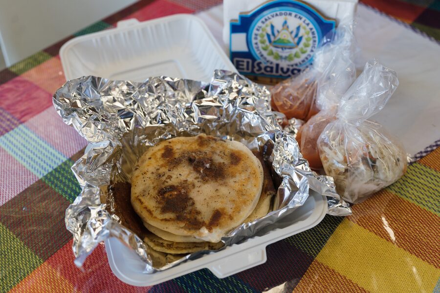 In a new wing of the food court, Roza L. Ramos Moran prepares Salvadoran food at her son’s stall, Pupuseria El Guanaquito Salvadoreno. Ramos Moran comes to Canada from El Salvador for several months each year to visit her son and grandchildren, she explained in Spanish. The restaurant specializes in El Salvador’s signature dish, pupusas: corn-flour flatbread stuffed with chicken, cheese, pork, octopus or loroco, a tropical vine with edible flowers.