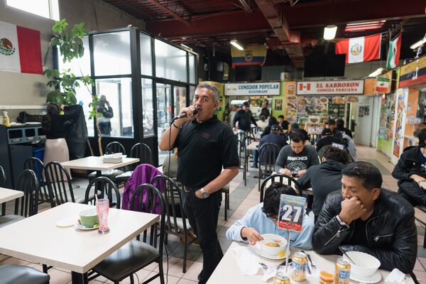 Rene Chavez, a recent migrant from Mexico, comes to the plaza every weekend to sing mariachi ballads for tips. Diners at the plaza can expect to hear singers such as Chavez smoothly switch between serenading customers and announcing the latest taco specials.