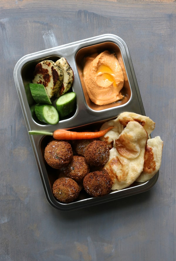 Pack: kibbeh, falafel, thick dips (such as hummus or labneh), mini cucumbers, cherry tomatoes, tiny carrots, olives, stuffed grape leaves, halloumi or feta, flatbread.