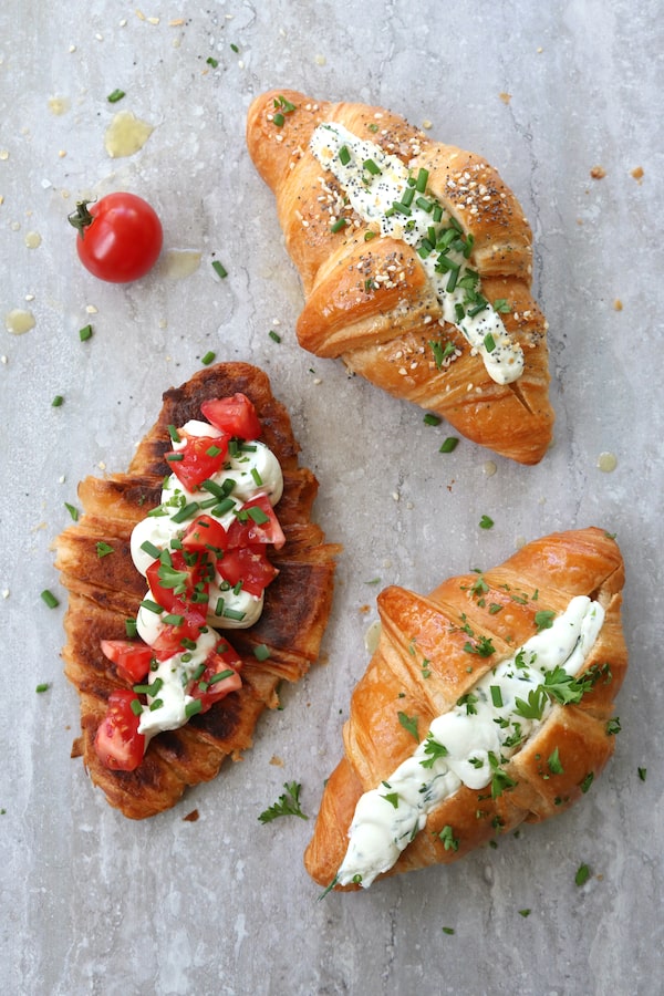 In the bowl of a food processor, pulse feta (a chunk about the size of your thumb per croissant) and a few chives with enough milk or cream to give it the texture of creamy frosting. Spoon into a Ziploc bag, snip off one corner, slice your croissants lengthwise and pipe in some filling. Alternately, pipe or spread the whipped feta over a flattened croissant that has been toasted in a skillet until crisp.