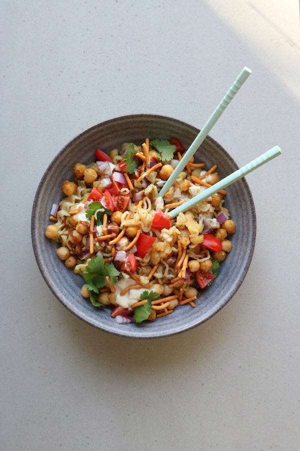 There are more ways to dress up a package of instant ramen than it’s possible to count. Do a Google search for TikTok ramen and you’ll get a stir-fried version with garlic, butter, soy sauce, brown sugar and an egg. There’s Korean budae jjigae (army base stew), made with processed meat, kimchi, gochujang and sliced American cheese that melts appealingly into the hot broth. There are versions made saucy instead of brothy with mayo, peanut butter or cheese, almost always with green onion and eggs, which are either stirred in over low heat to make a silky sauce, scrambled, poached in the broth, hard- or soft-boiled or fried to add on top. One of my favourite things to do with a package of Maggi 2 Minute Masala Noodles is make chaat – a snacky mix of flavours and textures perfectly suited to a package of instant noodles and a packet of spices.