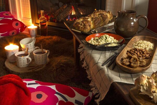 To suggest there are rules might be a tad severe, but there are traditions that just make sense. Set the right mood by dimming the lights, building a fire, stringing up a few fairy lights and lighting lots and lots of candles. There should be plenty of soft, woolly things, such as snuggly Oleana Knit Scandinavian blankets and hide rugs, whether reindeer, alpaca, sheepskin or faux. Place extra cushions on the chairs and oversized floor cushions by the fire. The cozy Nordic feeling should extend to the dress code. Think big, cuddly sweaters, fuzzy socks and, perhaps, a touch of Marimekko.