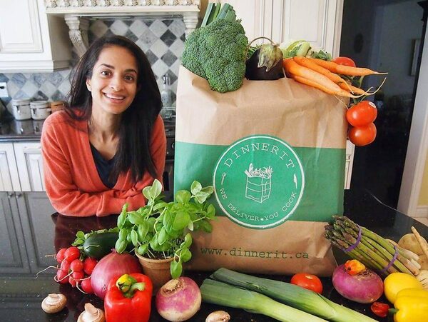 Owner Denise Fernandes with a Dinnerit recipe bag.