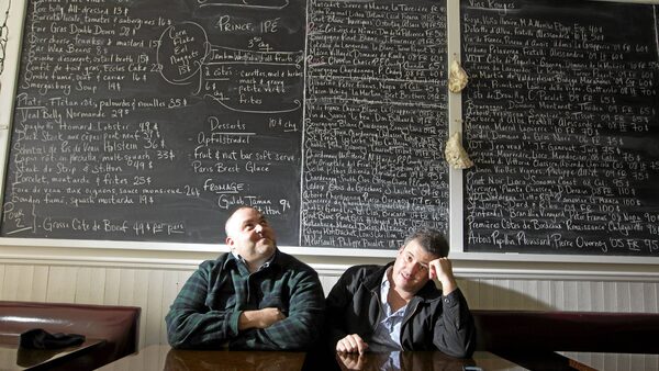 David McMillan (L) and Fred Morin, co-owners of the restaurant Joe Beef , sit in their restaurant, October 17, 2011.Christinne Muschi
