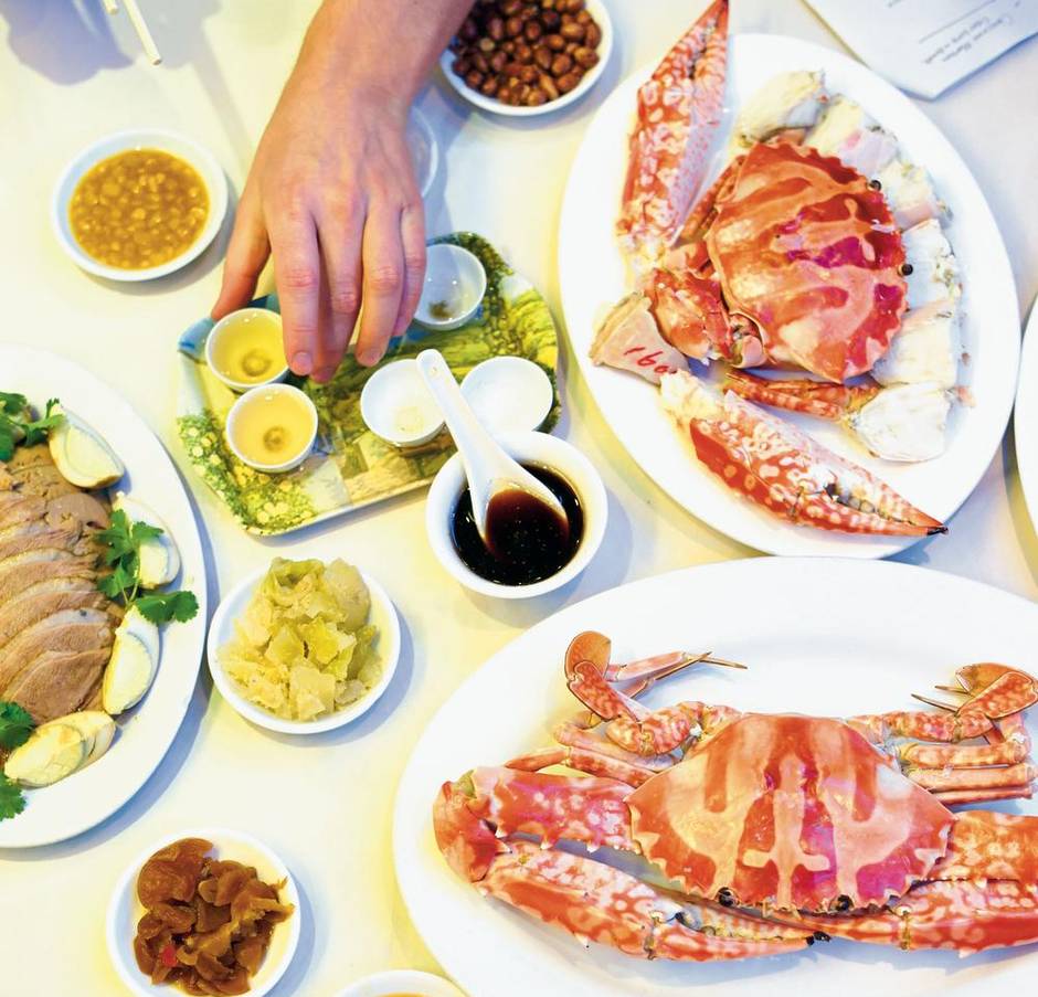 The restaurant’s star attraction is its cold roasted goose breast, served atop tofu marinated in what the owner calls “15-year-old sauce.” You dip the pieces of chilled fatty, salty poultry into delicate pink vinegar to cut its richness. It goes surprisingly well with the restaurant’s other specialty, cold flower crab. The red leopard print crabs are sold by the weight and even a small one will set you back the equivalent of $250.