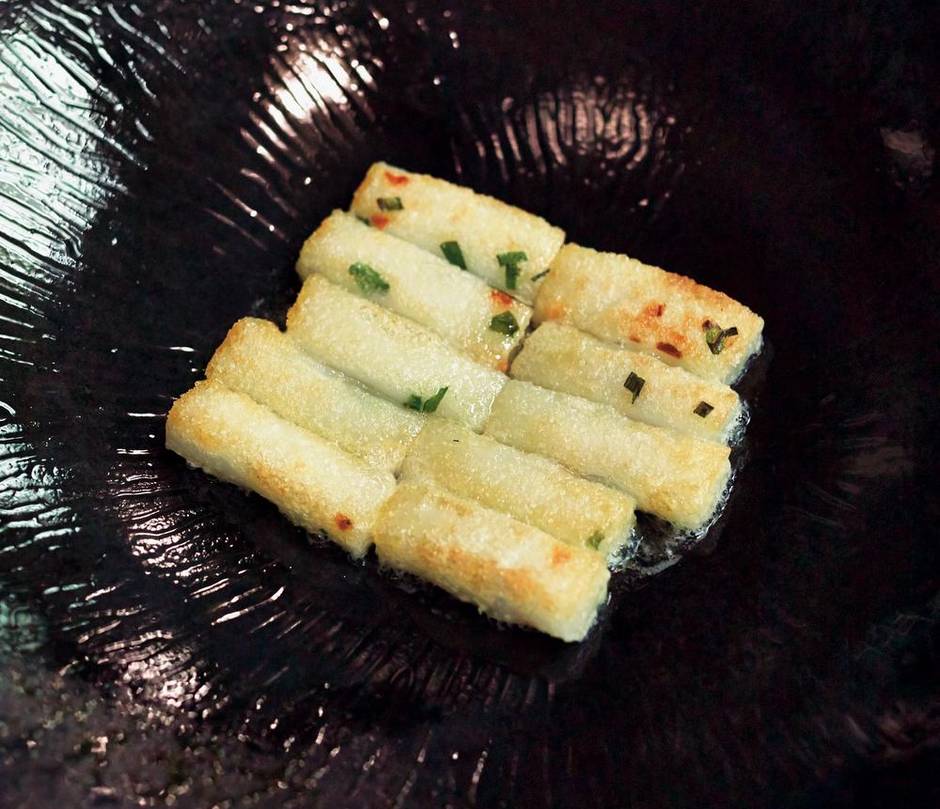The rice rolls are made with flat sheets of noodles that have been curled up and pan-fried, giving their exterior a golden-brown crust. Crispy on the outside, gooey tender on the inside and equally silky and salty, their texture is reason enough to travel to HK. They’re the sort of staple you can find on any local diner menu or at dai pai dongs, the open-air stalls where skewers of meat, kidneys, intestines and other wobbly gaskets steam away on the side of busy intersections. Their appearance at T’ang Court illustrates how that culture is increasingly influencing what’s on offer at the city’s higher-end establishments, and vice versa.