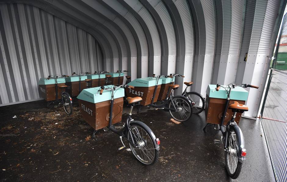 The idea for Feast also began as a marketplace for home cooks, says the company’s chief executive officer, Steve Harmer. But after some initial research, Harmer quickly realized that the model “didn’t really make sense.” Instead, the company set up its own commercial kitchen, with a crew of 13 cooks, to provide instant delivery. Each day, Feast workers load up a fleet of five cars and 17 bikes with dozens and dozens of meals before the lunch rush, each of which are each assigned to strategic zones in downtown. From there, the drivers are dispatched to deliver orders as they come in.