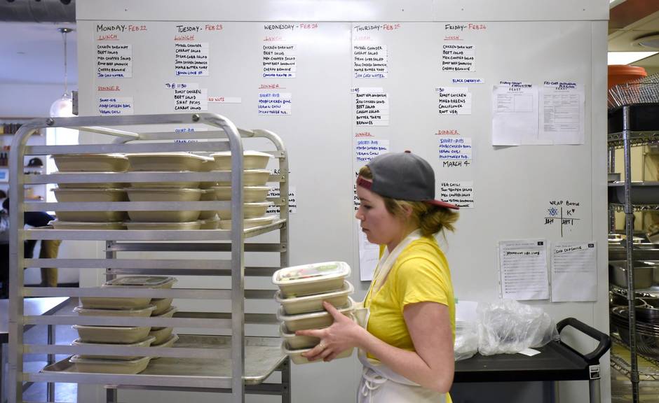 By 7 a.m. most days, the Feast kitchen is in full swing prepping for lunch service – a menu that emphasizes local, sustainable, healthy options under the watchful eye of executive chef Curt Martin. Most of the meals are prepared by mid-morning, at which time the Feast cooks turn their attention to packing. The steak Cobb salads and jerk chicken sandwiches are placed in compostable boxes, while the chowder is carefully ladled into small clear containers the size of a margarine tub. The hot items are placed in large warming bags, and cold items are stored separately.