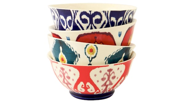 Tie-dyed ikat textiles from Central Asia have been big in home decor of late, their bold colours and patterns adorning everything from rugs and throw pillows to bedding and upholstery. Now, the look is making its way into the kitchen as well with Anthropologie's vividly hued ceramic bowls bearing dynamic weave-evoking designs sure to enliven your morning muesli. Pass the yak's milk!