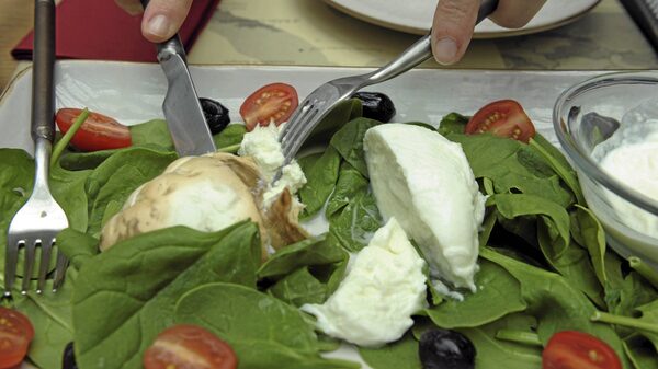 When pressed gently with a fork, the layers of the mozzarella should not come apart and the exterior "shell" should not crack.