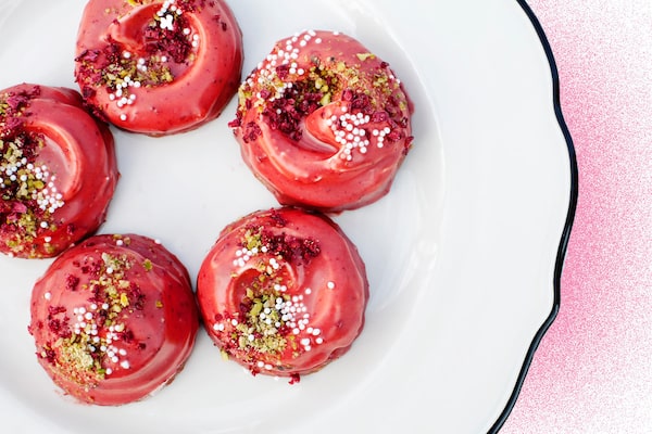 For the coating, melt the strawberry or raspberry candy (or white chocolate) and coconut oil over a bain-marie (double boiler), stirring regularly. Once melted, remove from heat. Pour into liquid measuring cup or similar, so that the coating is deep enough to dunk the marshmallow without hitting the bottom of the container. Dip the cookies, then set on a cooling rack set over a baking tray to catch drips. Alternatively, spoon the coating over the cookies. After about a minute, adorn with sprinkles, berry powders or ground pistachios as desired. Let set in fridge, uncovered. Any leftover coating can be covered and refrigerated, then used as a topping for ice cream; rewarm as needed.